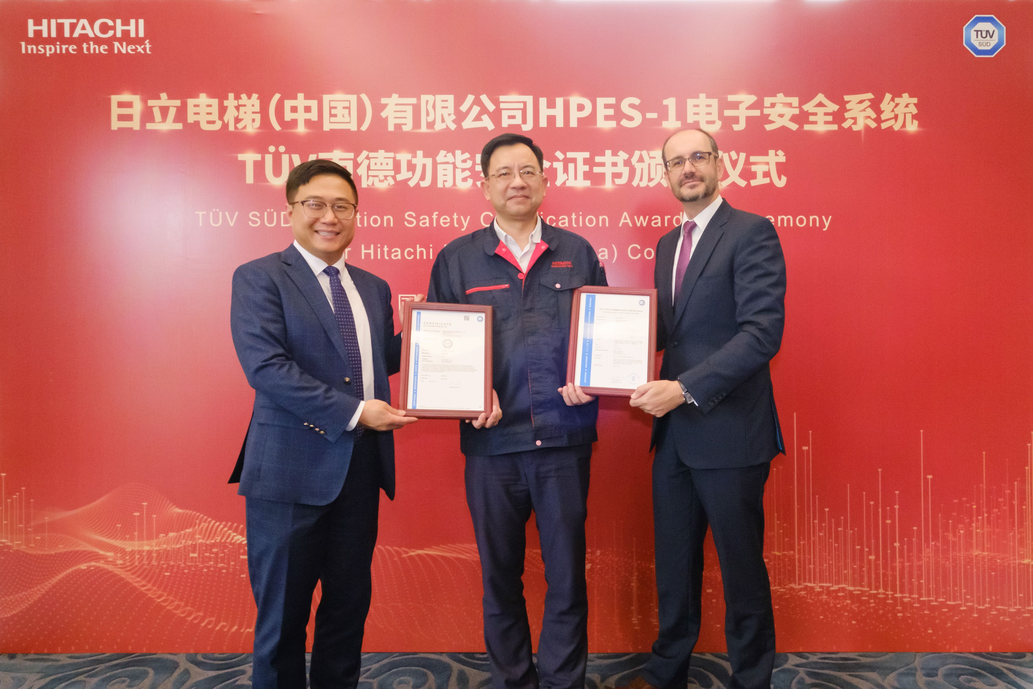 经过TÜV南德德国总部和大中华区技术专家的共同评估,证实日立电梯HPES-1电梯电子安全控制系统符合欧盟电梯安全法规标准,实现了功能安全性能级别SIL3(安全完整性 3),为目前电梯行业国际安全认证的最高等级,授予TÜV南德大中华区首张PESSRAL欧盟电梯指令EU证书以及TÜV SÜD Mark IEC 61508功能安全认证证书。