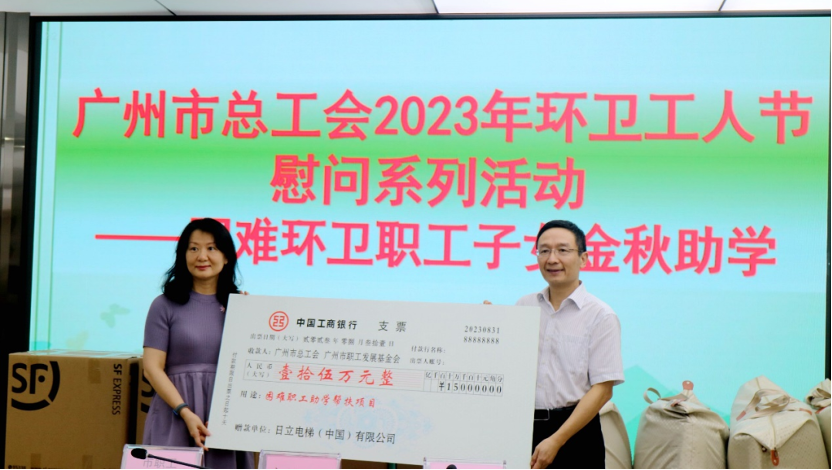 8月31日,日立电梯(中国)有限公司联合广州市总工会共同开展2023年广州市困难环卫职工子女“金秋助学”活动,助力108名环卫职工家庭的高考学子求学圆梦,为学子们发放助学金和准备学习生活物品。这也是日立电梯连续17年支持广州市“金秋助学”活动。